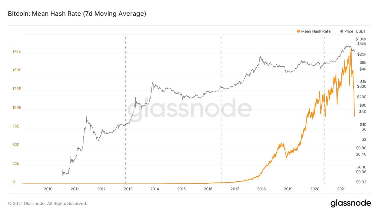 Desde mayo el precio de BTC ha bajado casi un 50%, y en consecuencia el hashrate ha bajado: un 50% también.