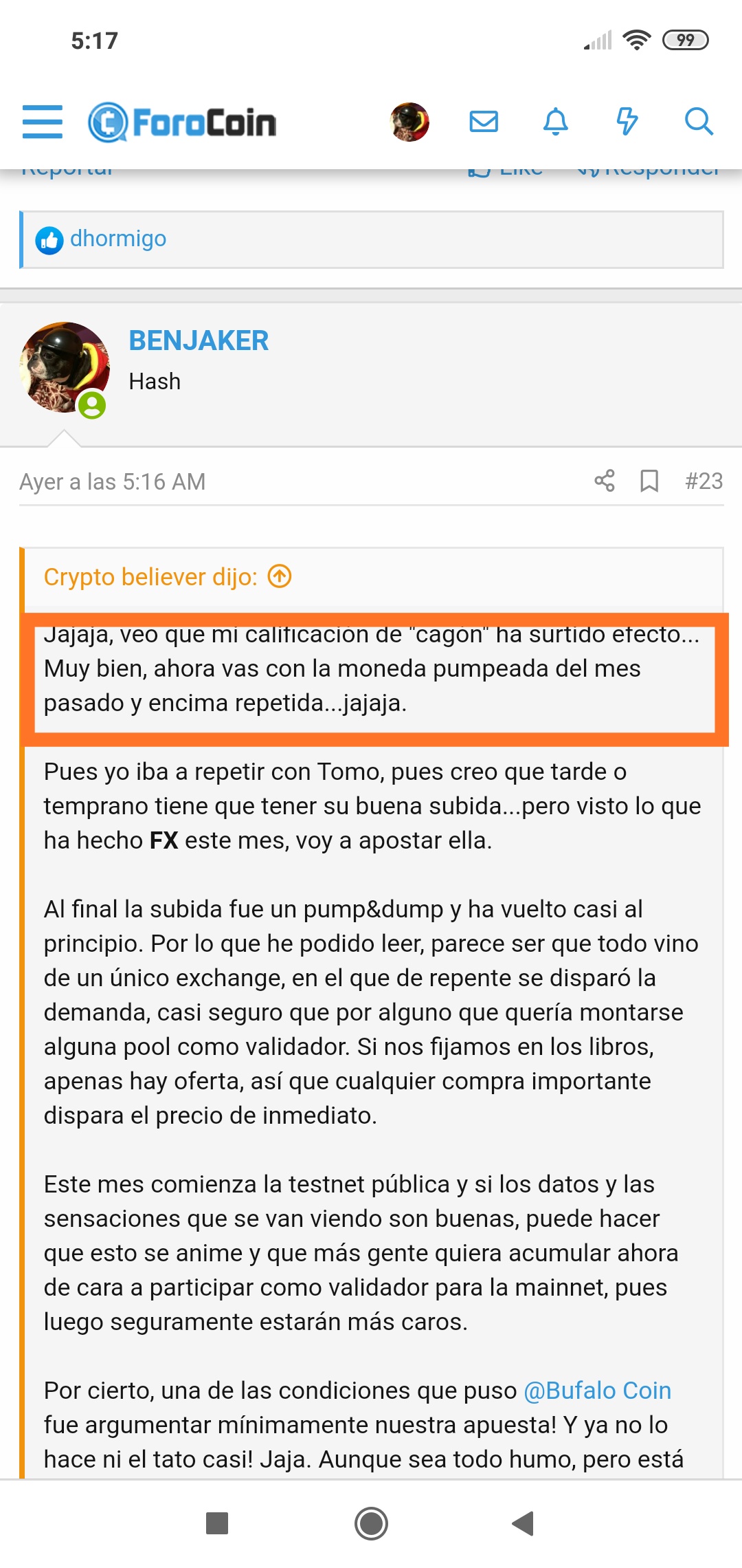 Por cierto, una de las condiciones que puso @Bufalo Coin fue argumentar mínimamente nuestra apuesta! Y ya no lo hace ni el tato casi! Jaja. Aunque sea todo humo, pero está bien leer las pajas mentales de la gente con sus apuestas hombre! Jaja.