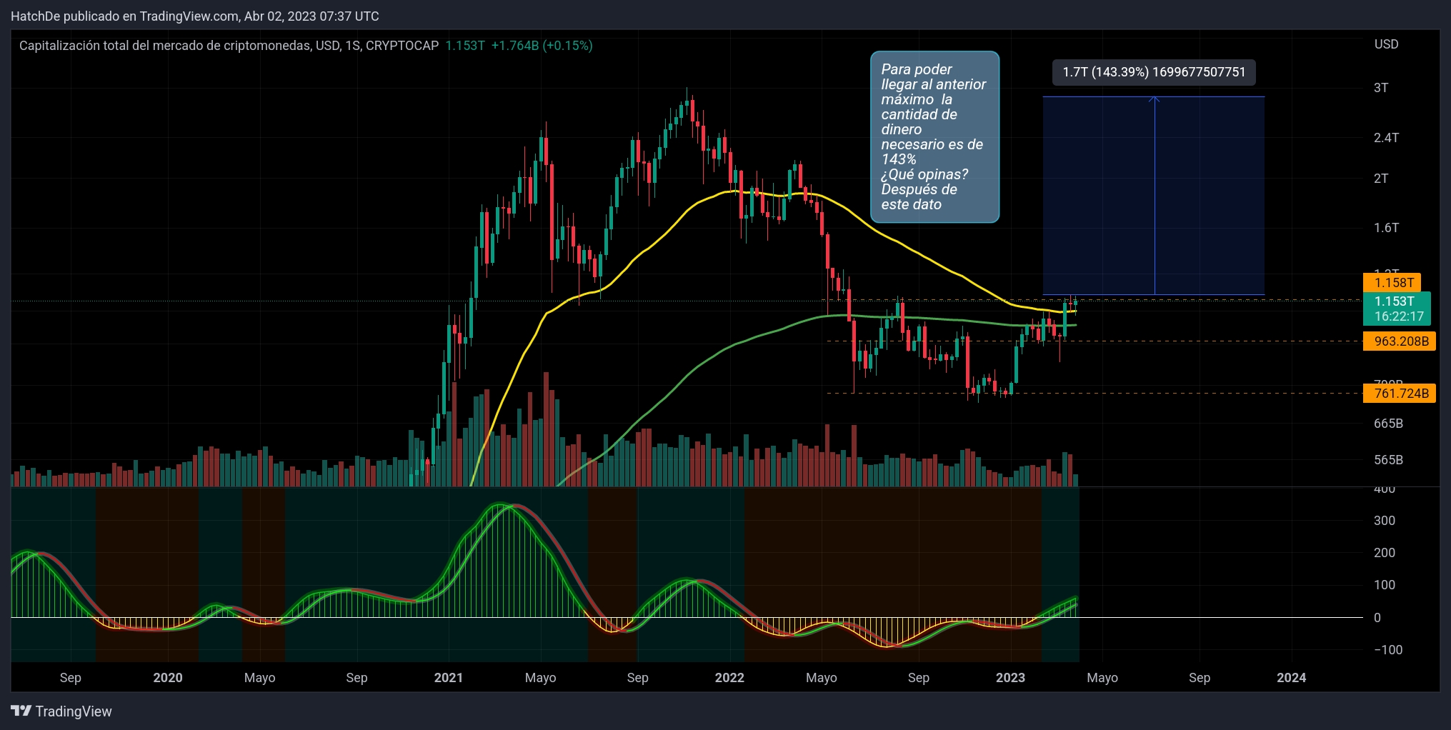 Si cerramos este mes por encima del 23300$ como todo parece indicar el gráfico mensual es claramente alcista. Hemos roto la resistencia muy importante que teníamos y hemos dejado atrás la bajada de precio que hubo con el descalabro de FTX. Parece que irá a tocar los 35'000$ ( si lo hace, ni idea cuando sería )