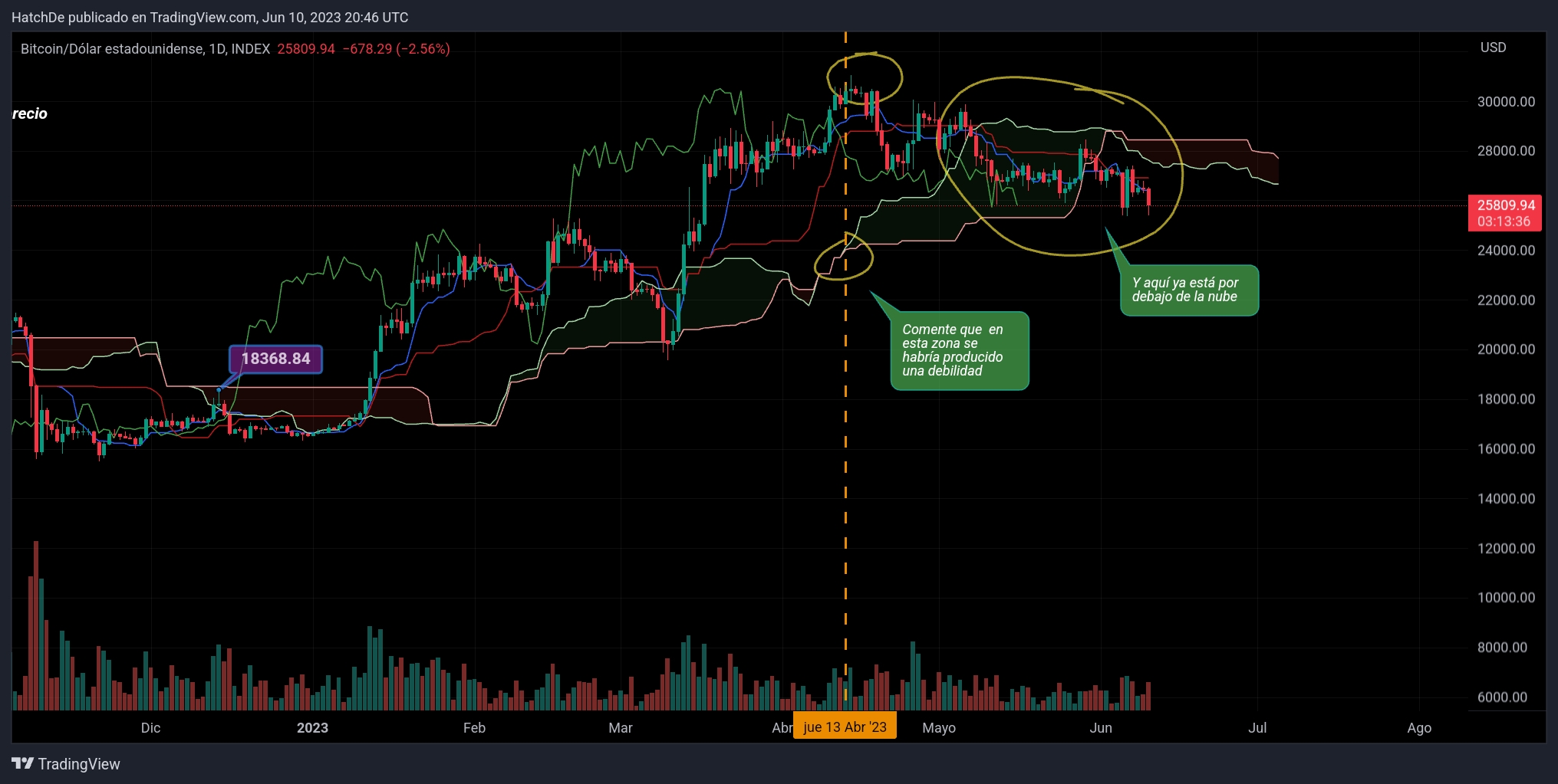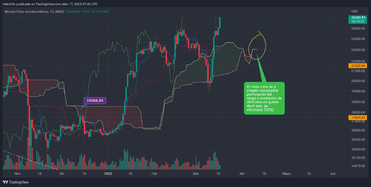 Suelo tener en cuenra la Nube de Ichimoku porque me da idea que puede ocurrir en un futuro próximo y el la primera quincena de marzo se dio una debilidad en la nube, cual ce hizo efectiva y ya estamos por debajo de la nube.