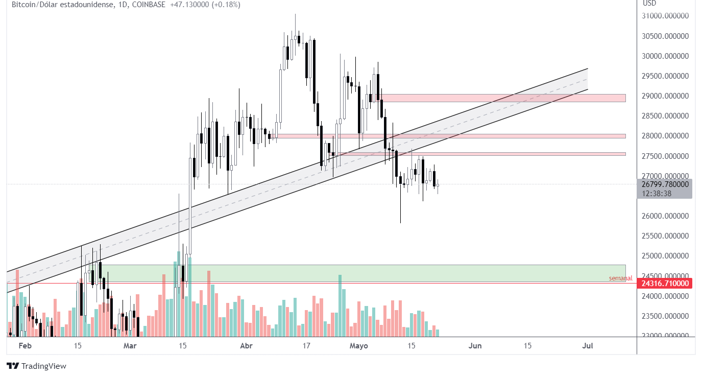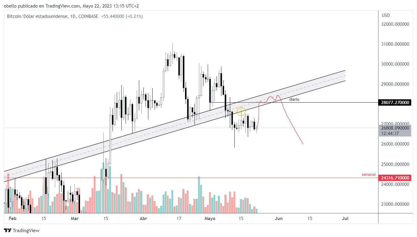 semana movida con las últimas noticias (SEC-Binance-Coinbase, securities ). Si tomamos el gráfico del 22 de mayo, ha seguido bastante bien la linea roja, ha vuelto a tocar el canal y se ha estrellado contra la resistencia diaria 28100 ( reacción contundente a la baja ). Realmente nada muy sorprendente si miramos los gráficos semanales y diarios.