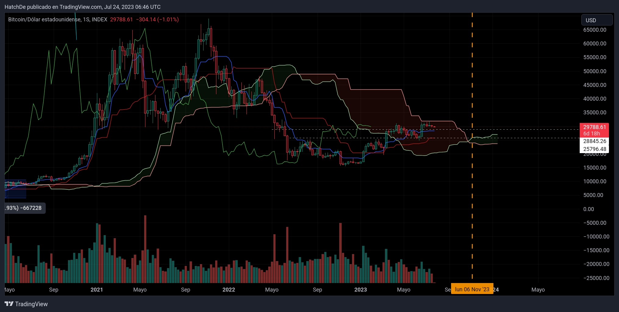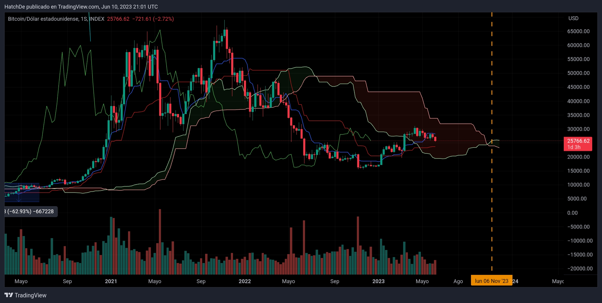 Algo más de un mes y está es la evolución, según lo que puedo interpretar apartir de octubre o noviembre BTC debe de romper la nube en TF semanal, ahí está la debilidad y el gráfico posterior es la evolución hasta el momento