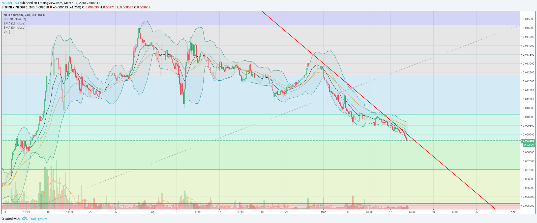 El punto en el que esta ahora de los 8600sat lo veo muy bueno, es una resistencia interesante y es mas veo difícil que llegue a la siguiente que estaría en los 7000sat. El tema es que en un principio a la larga los dos van a ser puntos de entrada buenos, estoy seguro ( uno mejor que el otro claro esta, pero ambos buenos) Las dudas vienen sobre el mercado mas que sobre NEO en si. Quiero decir si la tendencia general del mercado sigue bajista, es probable que NEO siga bajando... Un buen momento para entrar seria cuando rompiese esa linea de tendencia, (o mirando el gráfico de $ salga del canal)
