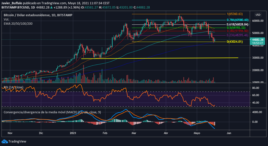 Podemos apreciar la imagen y comprobamos que la gráfica no miente y ha tocado el Soporte con precisión de relojero en la EMA 200 y coincidiendo con el retroceso fibonacci del 0 (retroceso completo). Este soporte es clave, pues una rotura de este nivel si que podría significar abismo y no encontramos soportes fuertes hasta los 30.000$.