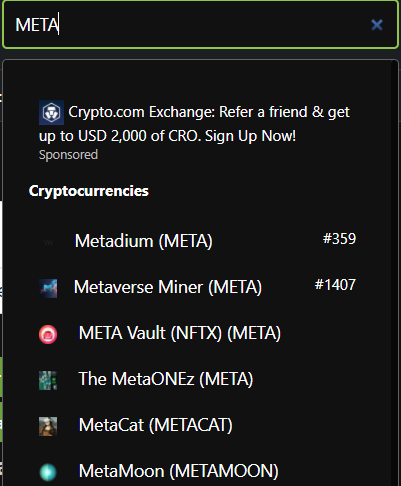Vale, gracias. Ya la vi META price today, META to USD live, marketcap and chart | CoinMarketCapSi no me equivoco se refiere a una memecoin, un shiba con unas gafas que se llama meta... Hace un rato iba en 1 lugar de ganadores de hoy en coinmarketcap.com....