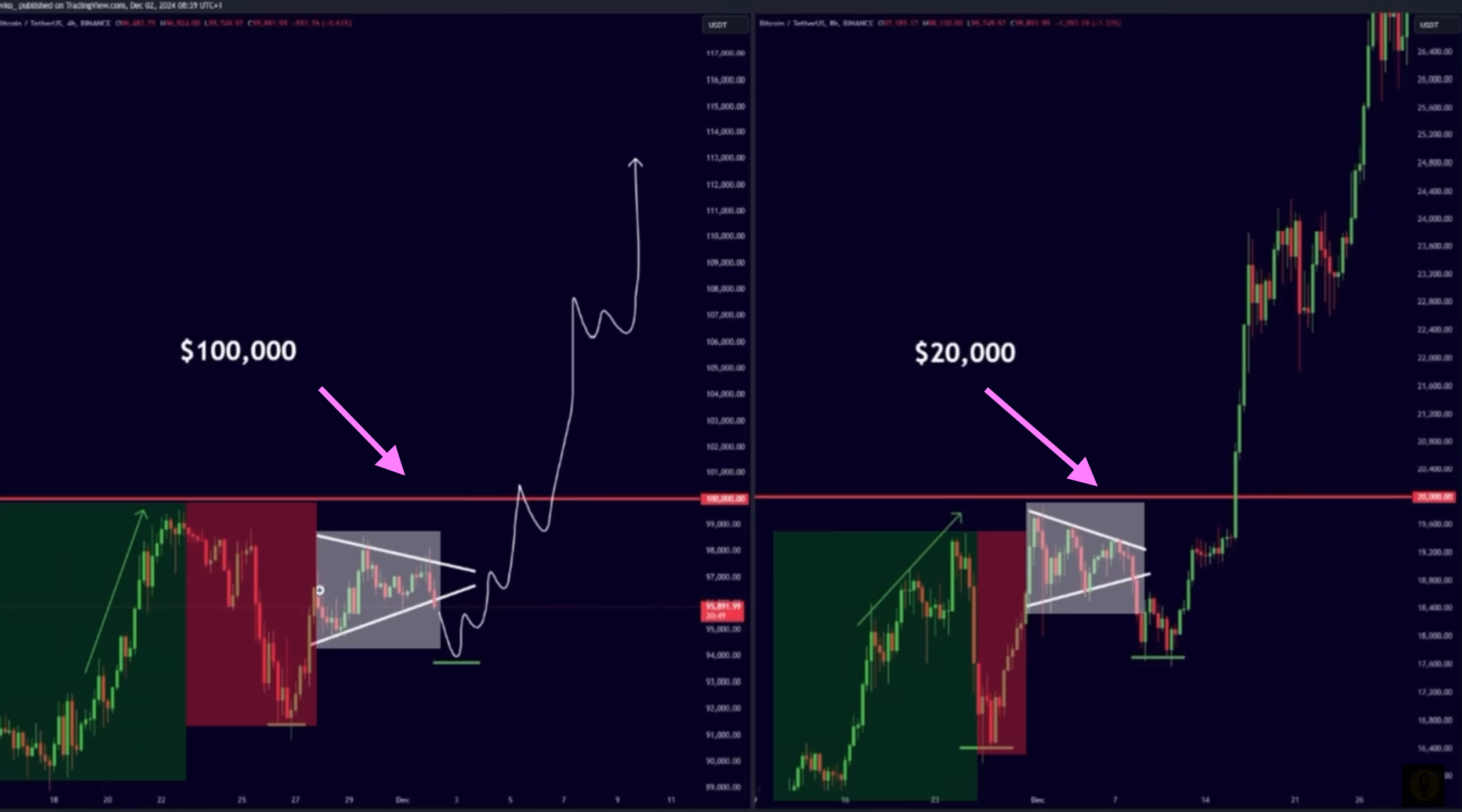 En precio os he puesto otra "caja" rosa, que es donde se moverá el precio hasta que les apetezca, quizá se rompa en poco tiempo, quizá la alarguen unos días más, sobre todo porque estamos empezando diciembre, pero si espero una ruptura violenta en precio de los famosos 100.000$, lo indico con esa flecha verde.