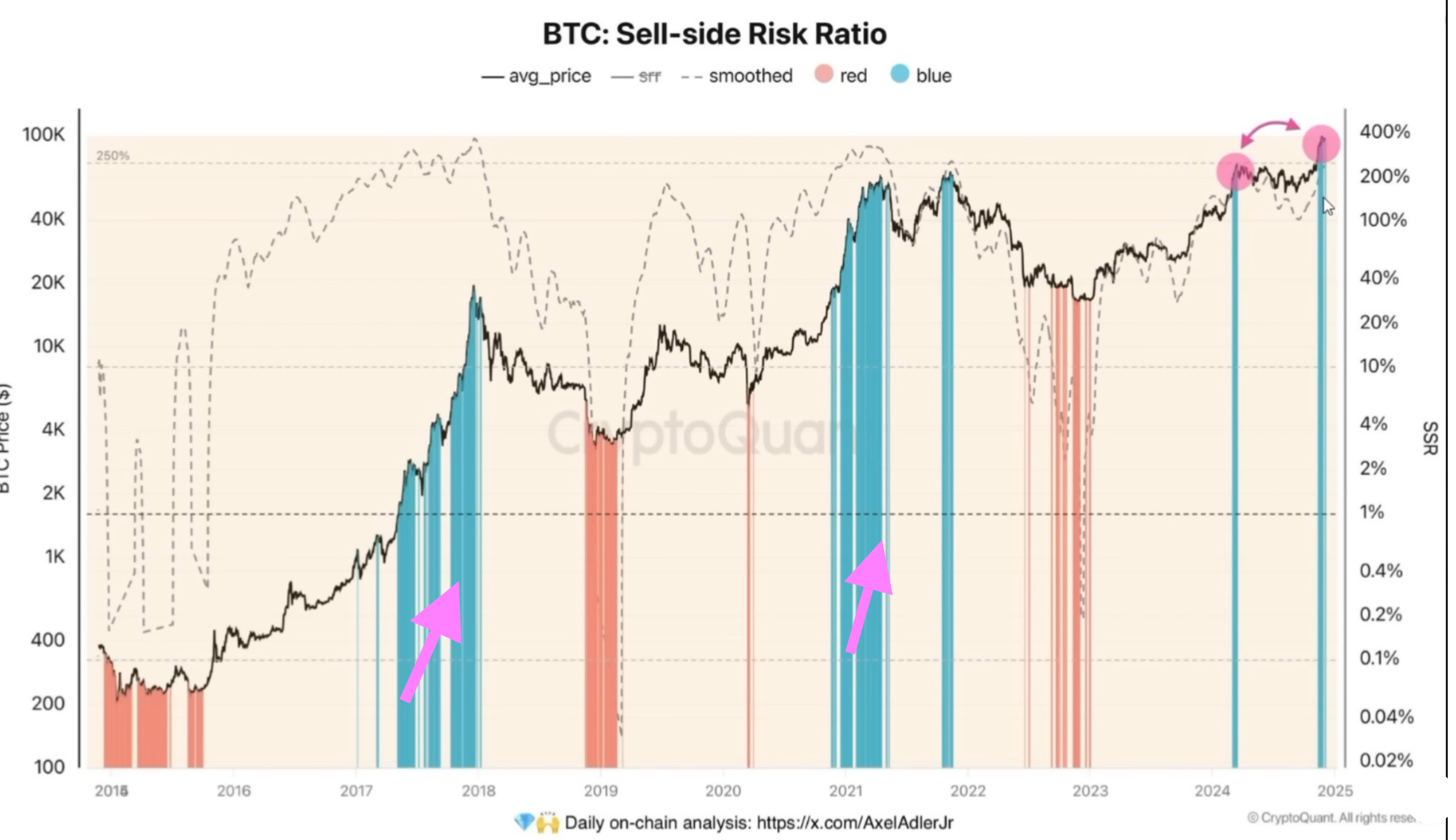 En esta métrica se ven las grandes compras en lo más alcista del mercado de 2017 y 2020, vemos un atisbo en este mercado 2024, esto también nos dice que debería faltar una fase 3 alcista con fuerte verticalidad.