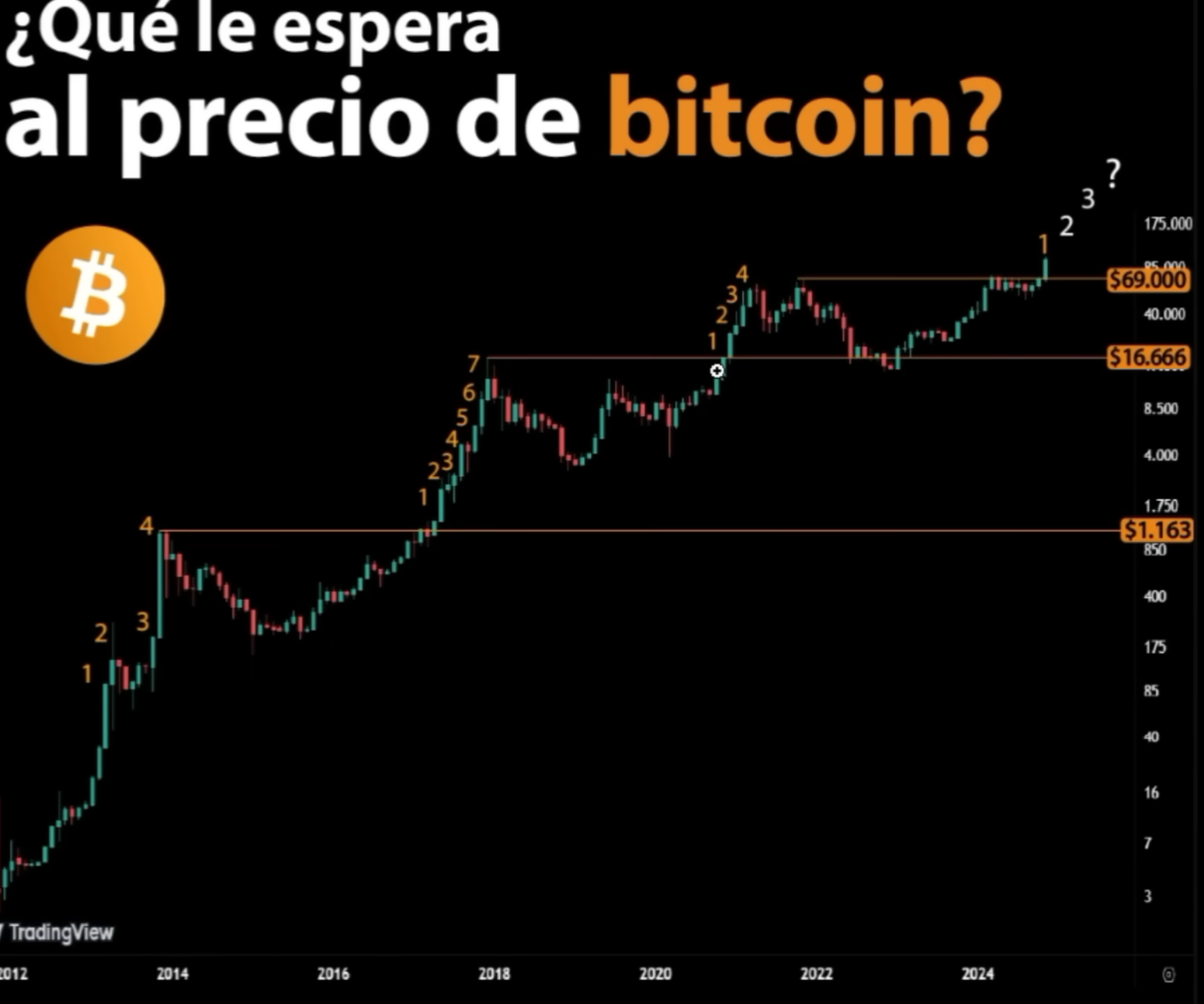 Esta es una especie de simulación del mercado alcista de 2020 y el mercado alcista de 2024. Ya os he comentado en varias ocasiones que los mercados no son iguales, pero tienden a "Rimar". En este caso vemos esos gallardetes blancos en 2020 y el que desarrollamos ahora 2024, se parecen bastante y os los indico con esas flechitas rosas. Según esto la gran subida o el tramo que yo llamaría 3, faltaría y sería brutalmente alcista.