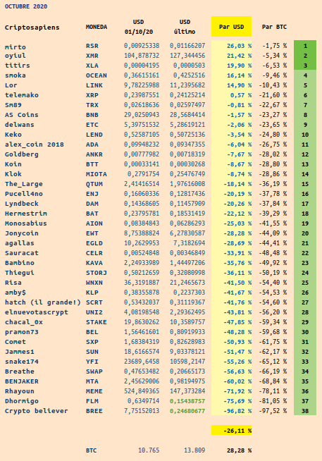 Daaa, esto esta bien chequeado? Otra vez raspando el primer puesto con XMR? La fucking verga amigo!!!!! jaja, encima me intriga saber cuanta cantidad de BTC me hubiese ganado! jaja. veamos con noviembre que pasa, pero vengo peleando el primer puesto desde que arranque.