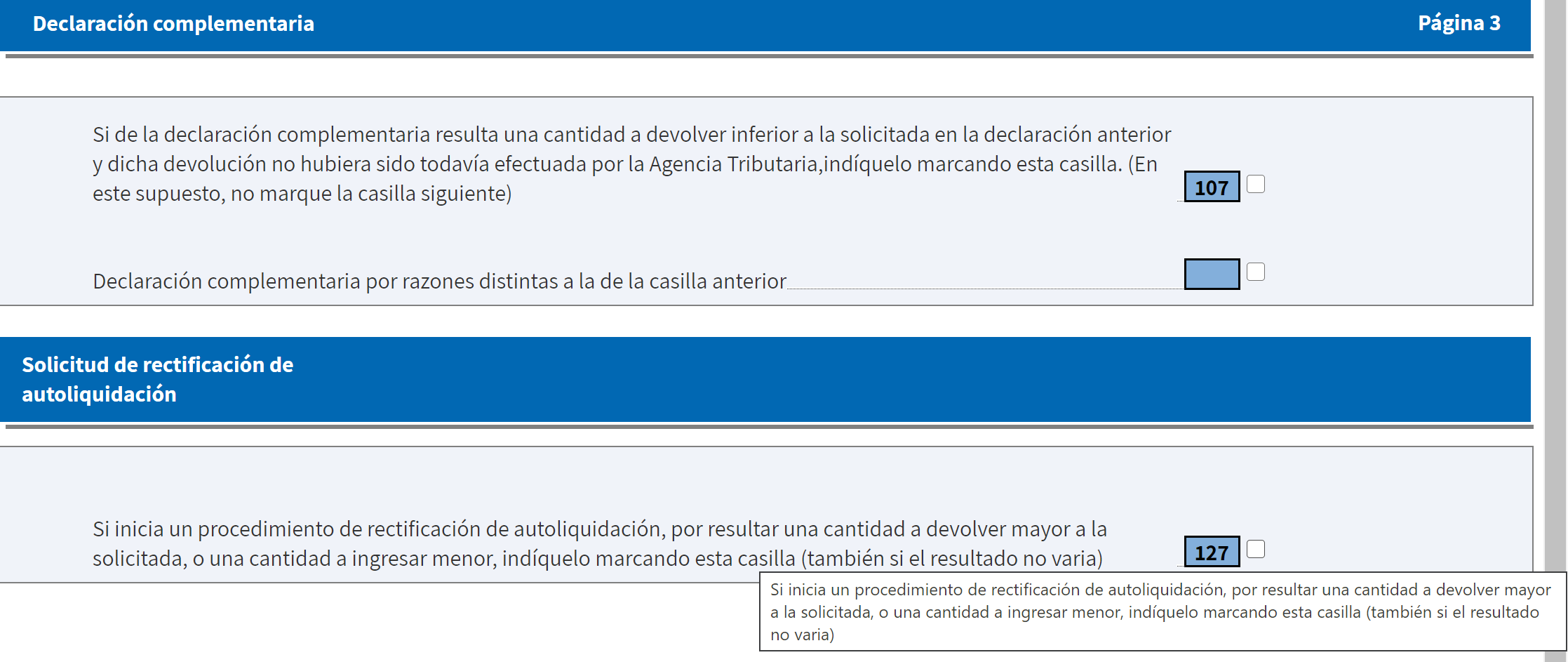 • Modificaciones que alteran el resultado de la autoliquidación a favor de Hacienda (menos devolución o más pago). En este caso, habría que presentar una complementaria. Se procedería igual que para el caso anterior, pero seleccionando la opción 107 en lugar de la 127.